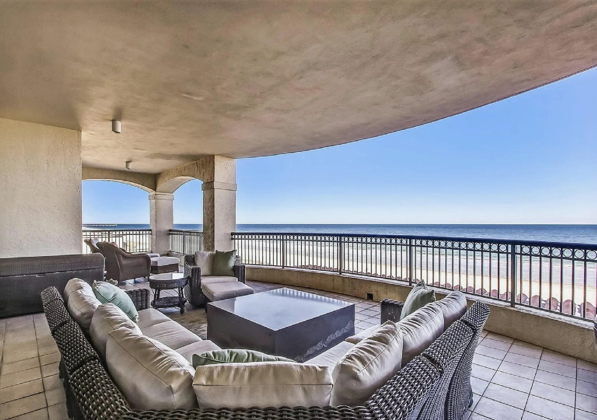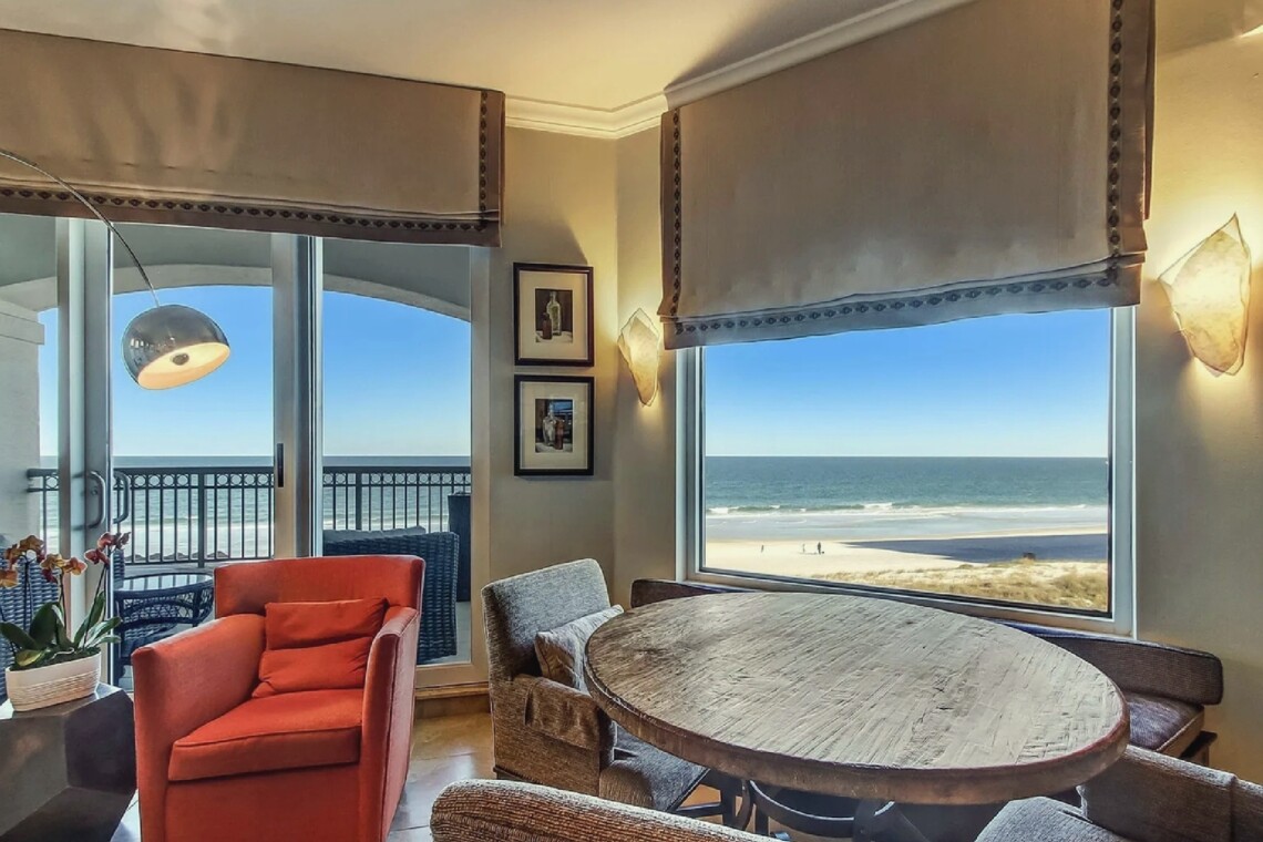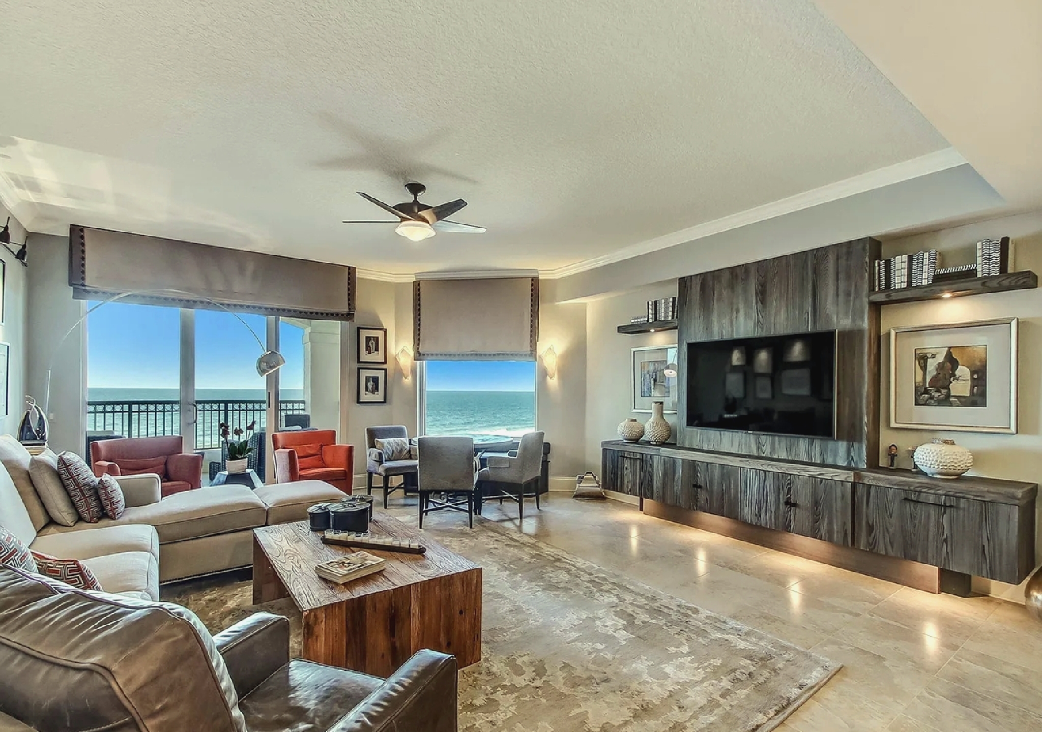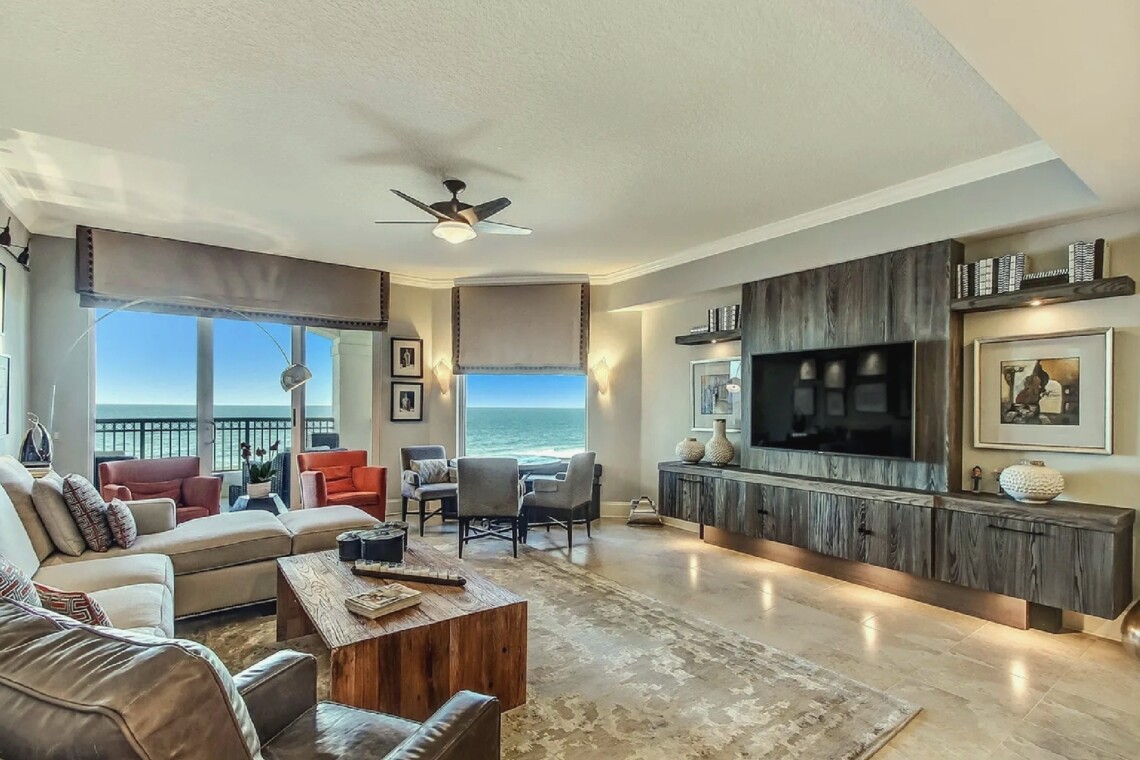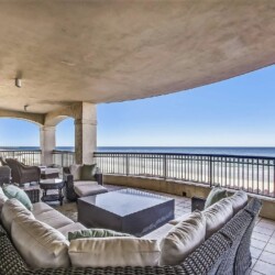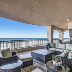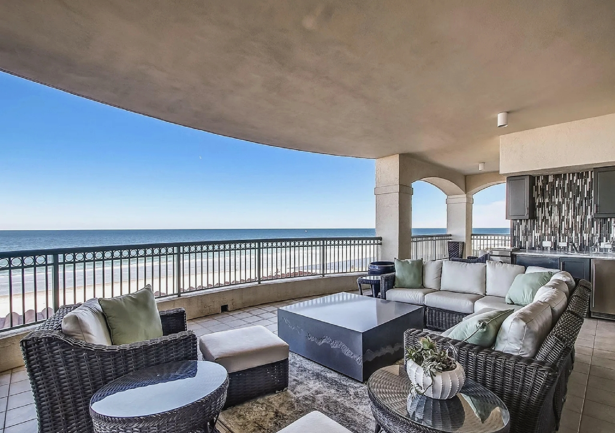 This four bedroom, five bathroom oceanfront condo at the Marbella Condominium offers more than 5,300 square feet of refined living space with sweeping views of the Atlantic from three private balconies, including an oceanfront terrace with a summer kitchen ideal for entertaining. The interior features high ceilings, an open layout, and a gourmet kitchen with Sub-Zero appliances, while one of the bedrooms has been converted into a private office for guest convenience. Building amenities include a heated beachfront pool, fitness center, and secure garage parking, creating a perfect blend of comfort and luxury for a memorable stay in Jacksonville Beach.