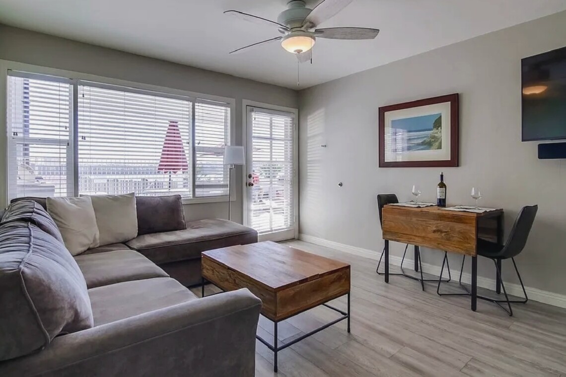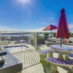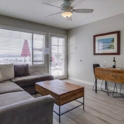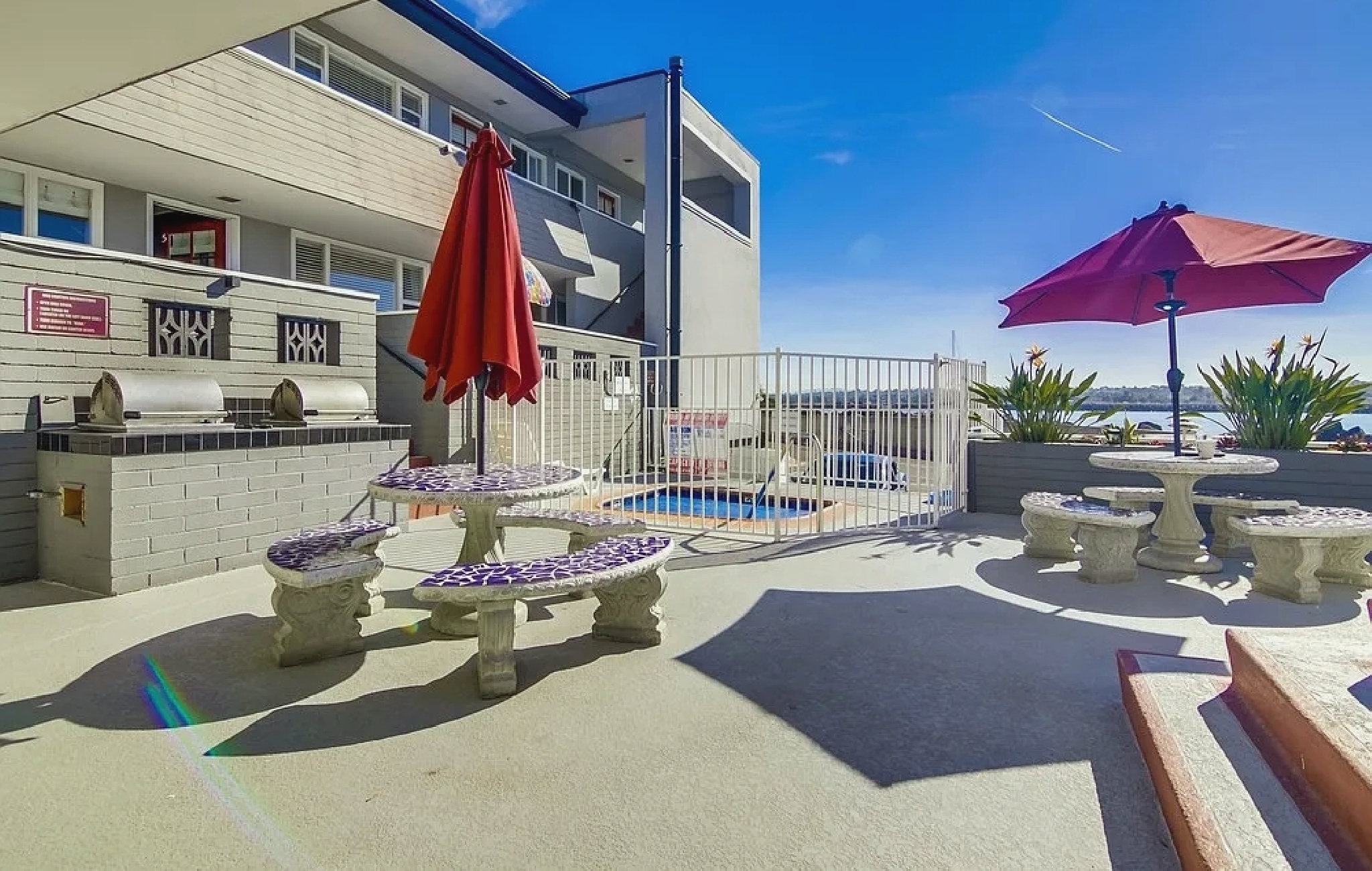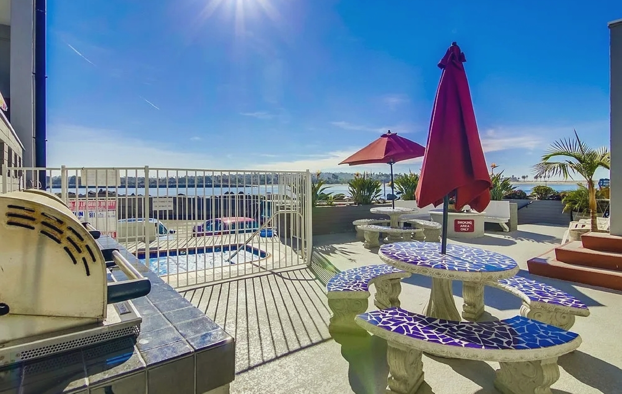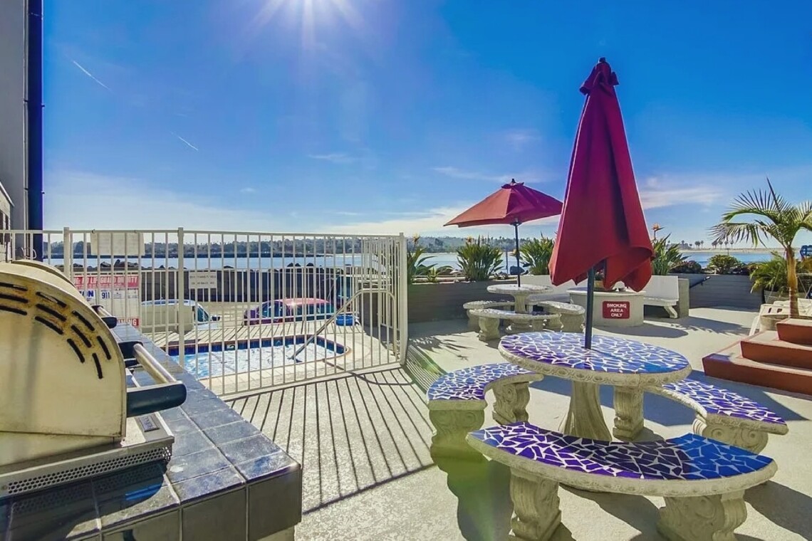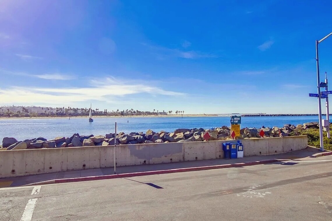 This one bedroom, one bathroom condo offers 408 square feet of living space with stunning views of both Mission Bay Channel and the Pacific Ocean. Recently remodeled and tastefully furnished, the residence provides a comfortable and convenient retreat with a bright living area overlooking passing yachts and sailboats. Just outside the door, guests can enjoy a shared patio with a hot tub, barbecue grill, lounge chairs, and dining space, all set in a prime location at the southern tip of Mission Bay.
