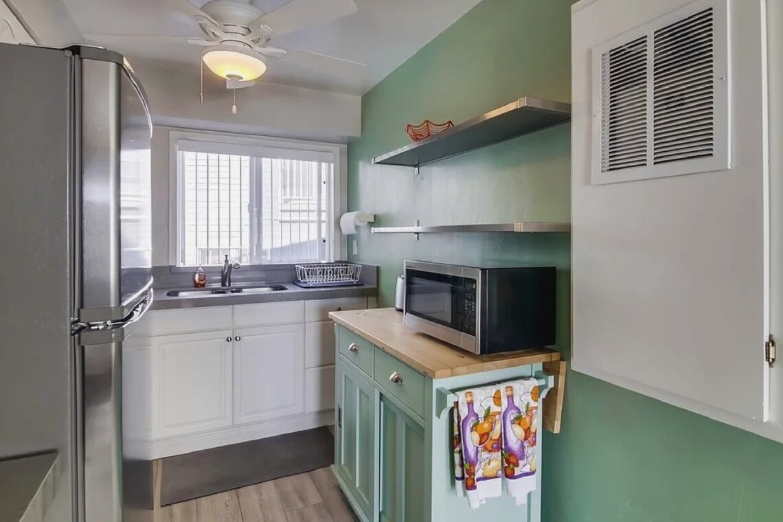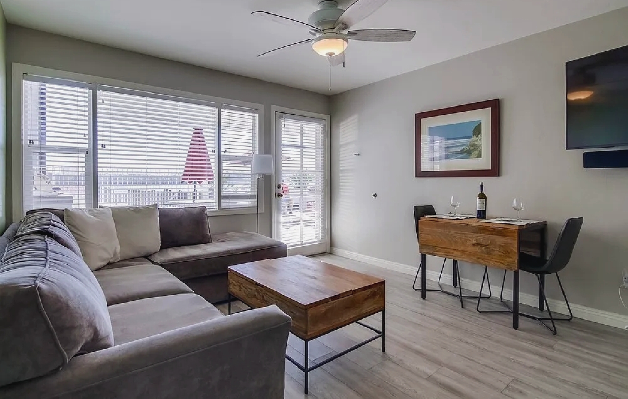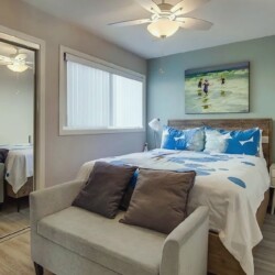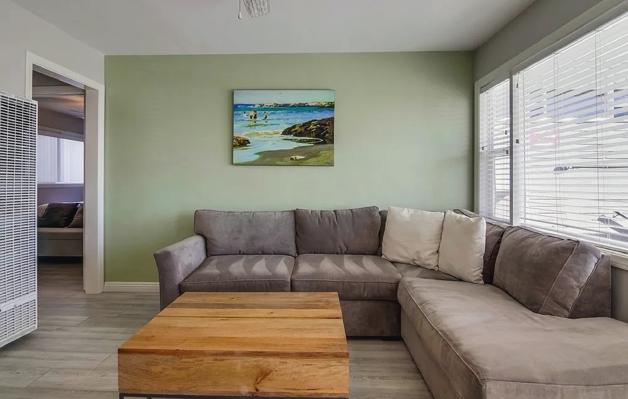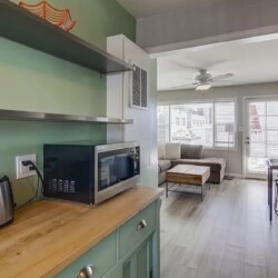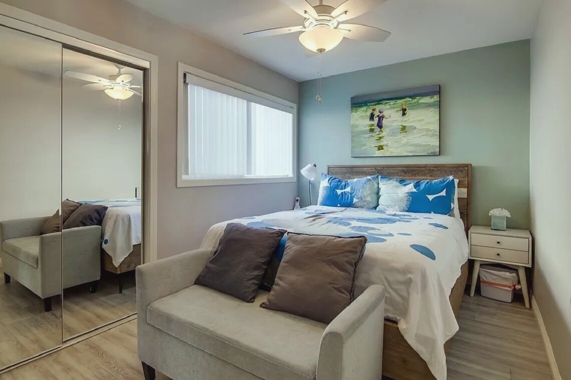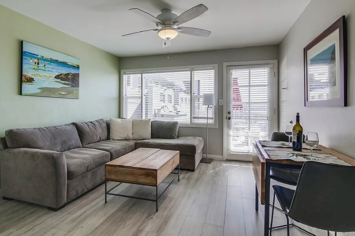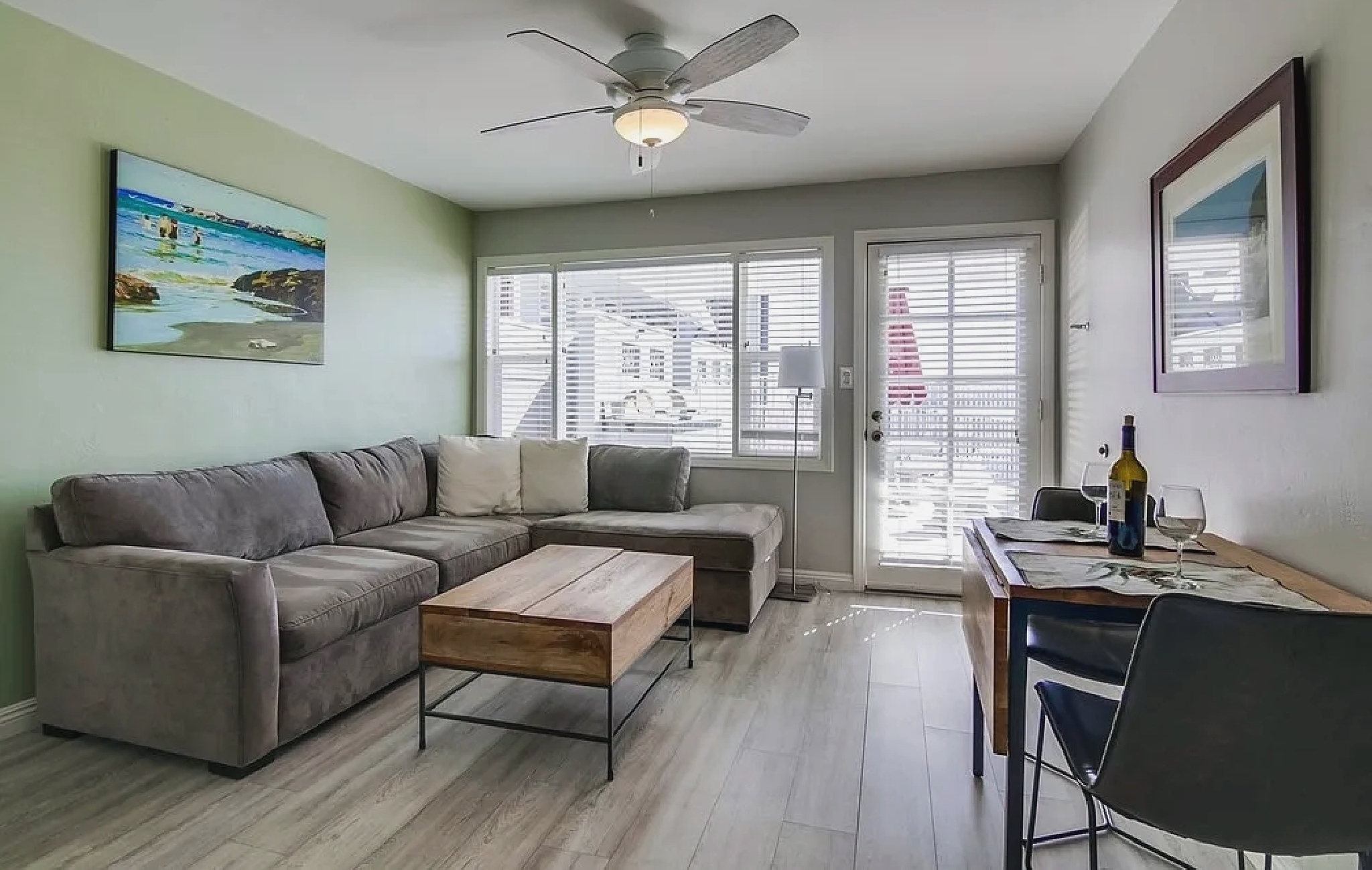 This one bedroom, one bathroom condo offers 408 square feet of living space with stunning views of both Mission Bay Channel and the Pacific Ocean. Recently remodeled and tastefully furnished, the residence provides a comfortable and convenient retreat with a bright living area overlooking passing yachts and sailboats. Just outside the door, guests can enjoy a shared patio with a hot tub, barbecue grill, lounge chairs, and dining space, all set in a prime location at the southern tip of Mission Bay.