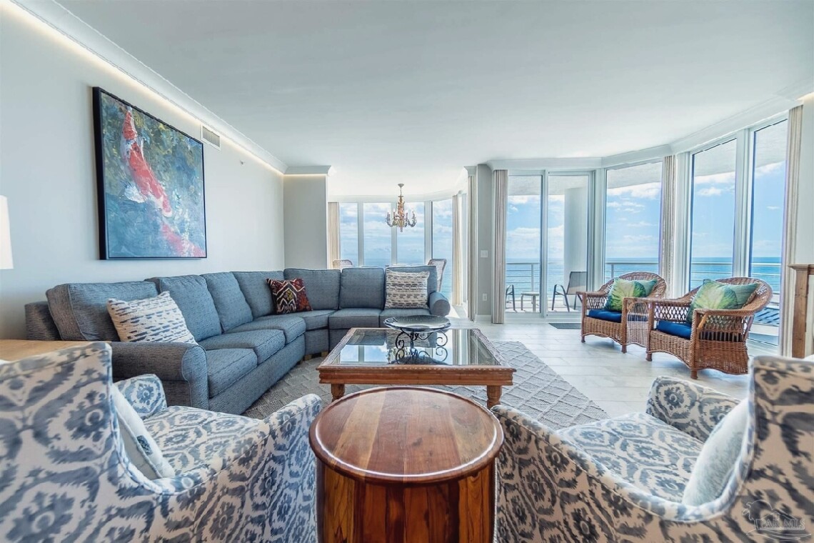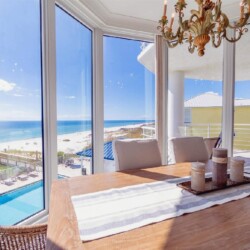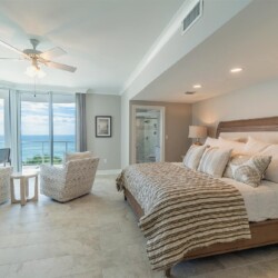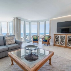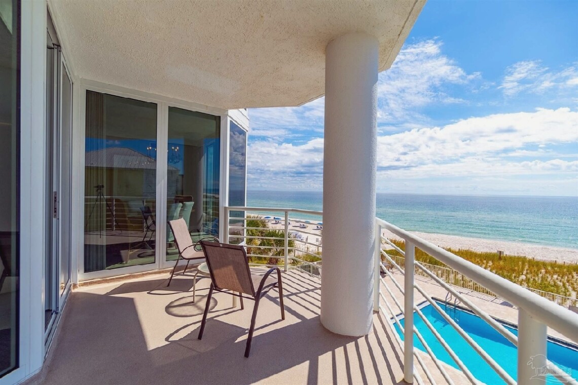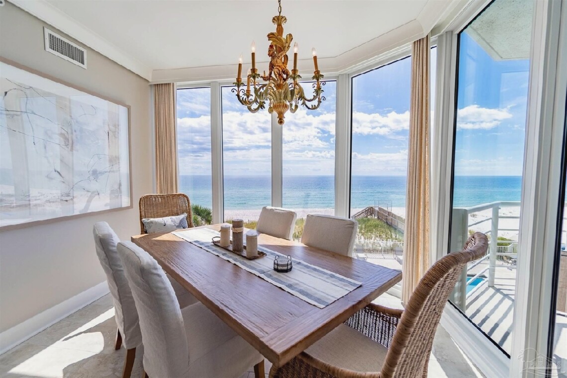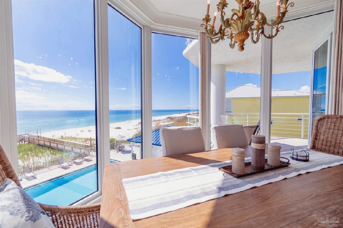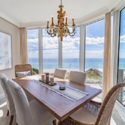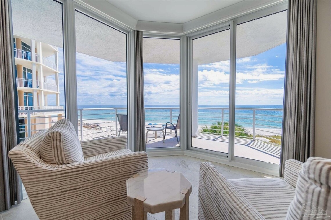 This three bedroom, three bathroom condo offers over 2,200 square feet of coastal living with dual terraces overlooking the Gulf and direct access to Rosamond Johnson Beach. The interior features a gourmet kitchen, bar area, and floor-to-ceiling windows that fill the space with natural light, all finished with elegant custom details. Guests can enjoy resort amenities including a Gulf-front pool, tennis courts, and fitness center within a secure gated community, making this residence a refined and private beachfront retreat.