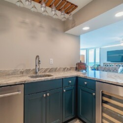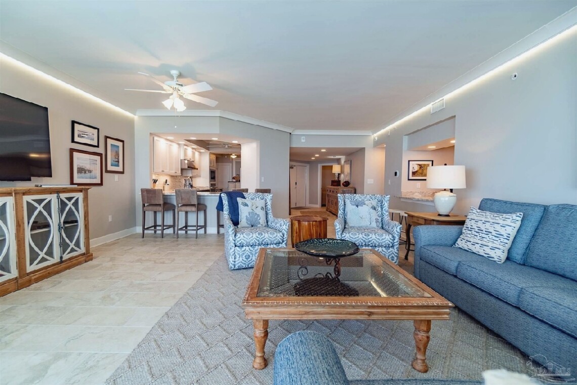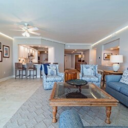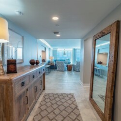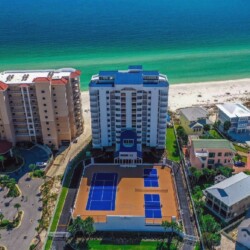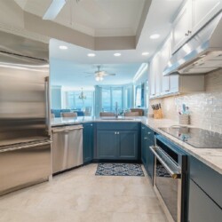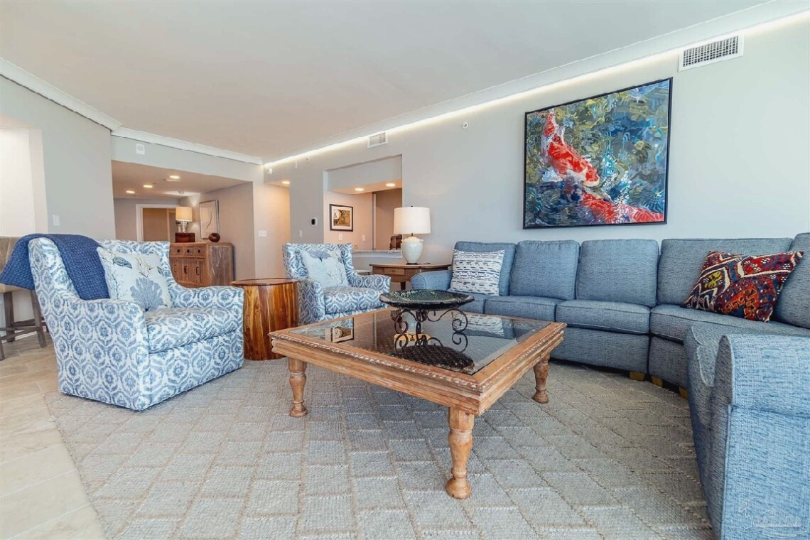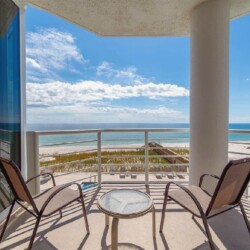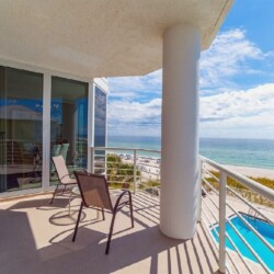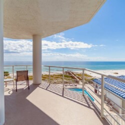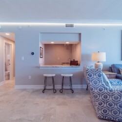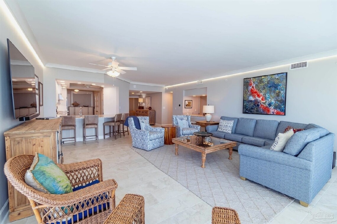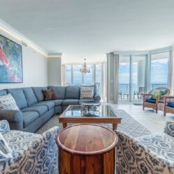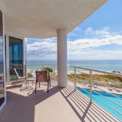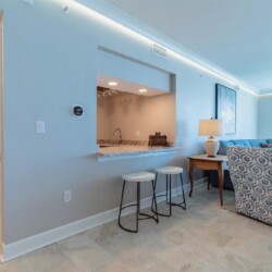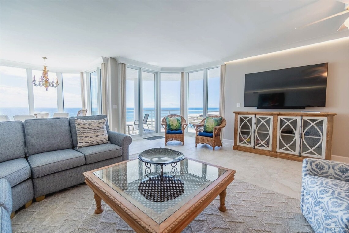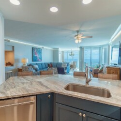 This three bedroom, three bathroom condo offers over 2,200 square feet of coastal living with dual terraces overlooking the Gulf and direct access to Rosamond Johnson Beach. The interior features a gourmet kitchen, bar area, and floor-to-ceiling windows that fill the space with natural light, all finished with elegant custom details. Guests can enjoy resort amenities including a Gulf-front pool, tennis courts, and fitness center within a secure gated community, making this residence a refined and private beachfront retreat.