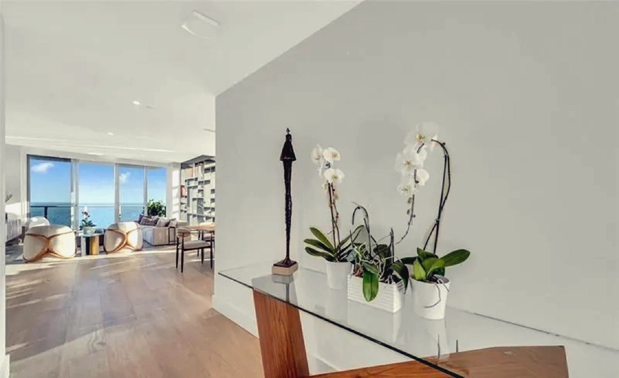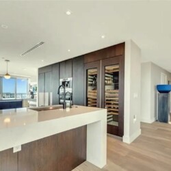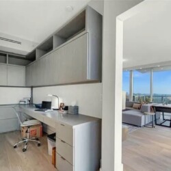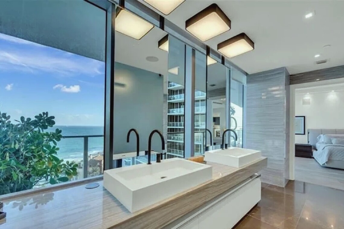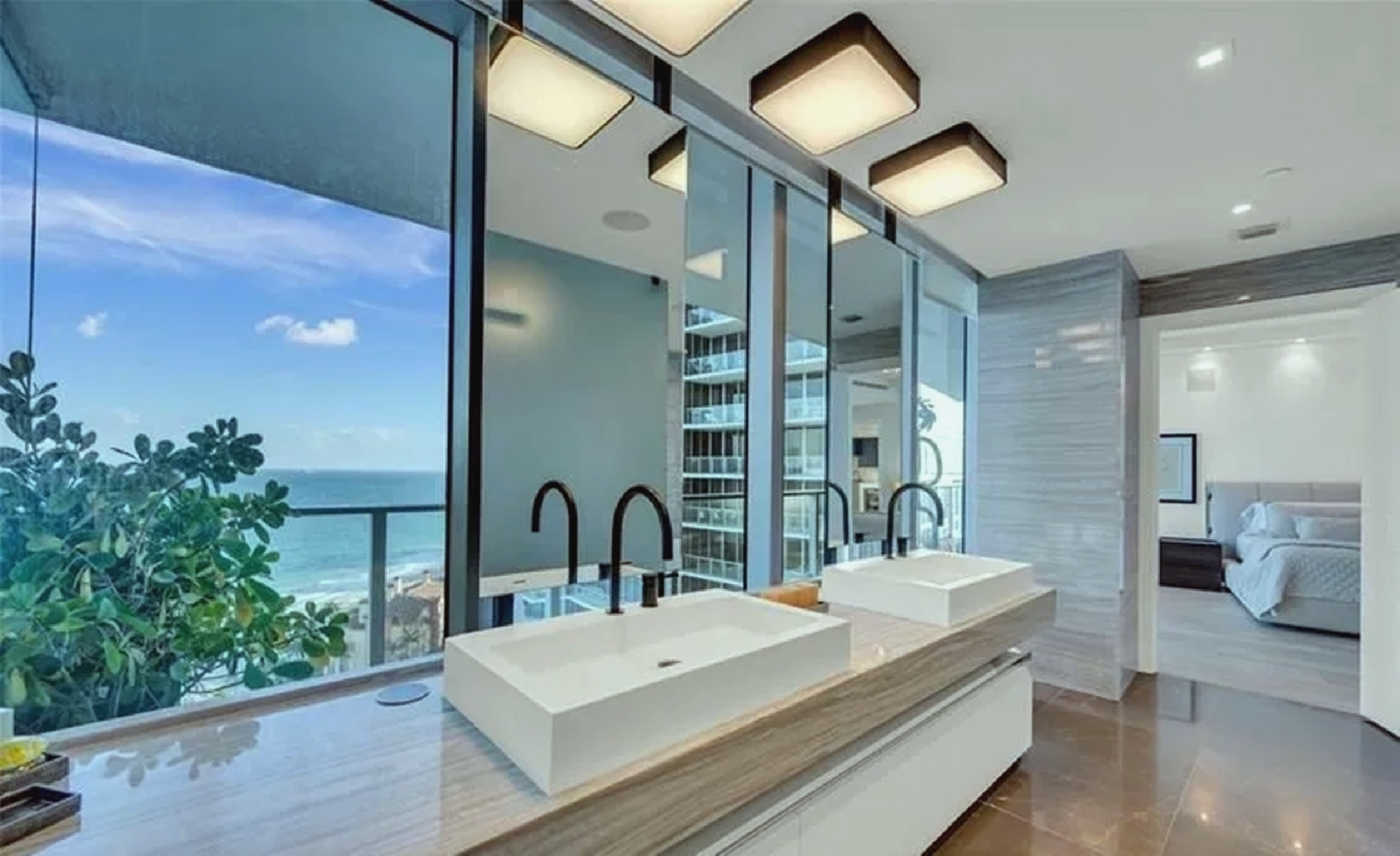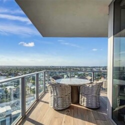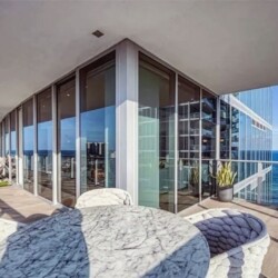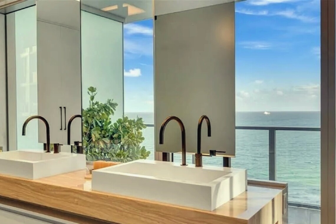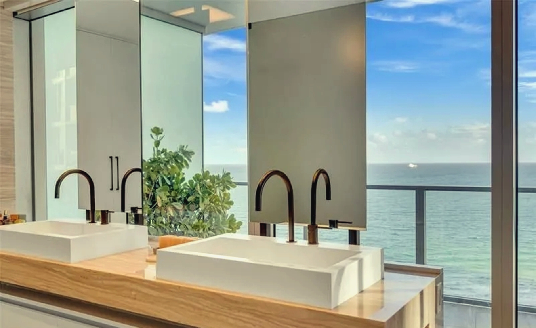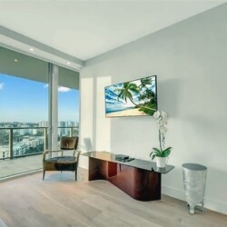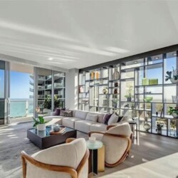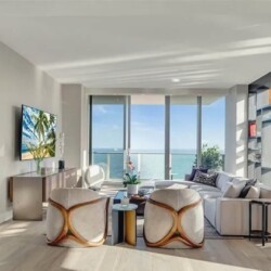 This three bedroom, four bathroom oceanfront penthouse offers over 3,400 square feet of refined living space with two private terraces showcasing sweeping views of the ocean, Intracoastal, and city skyline. The primary suite features dual sinks and a soaking tub, while the interior is finished with modern details, large windows, and custom built-ins that create a bright and elegant setting. Guests can enjoy resort-style amenities including a heated pool, cabana, fitness center, and café, along with two garage spaces and valet service for added convenience, making this residence an ideal destination for a luxurious coastal stay.