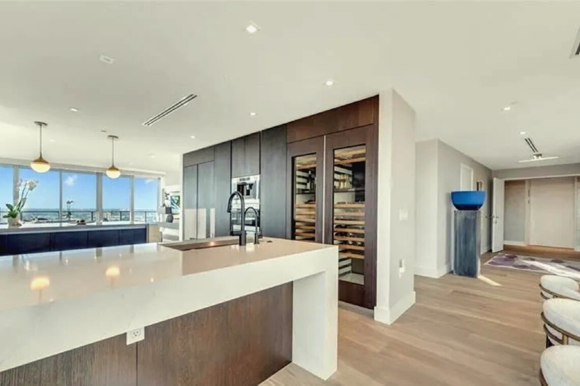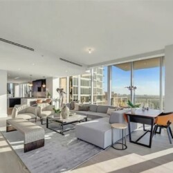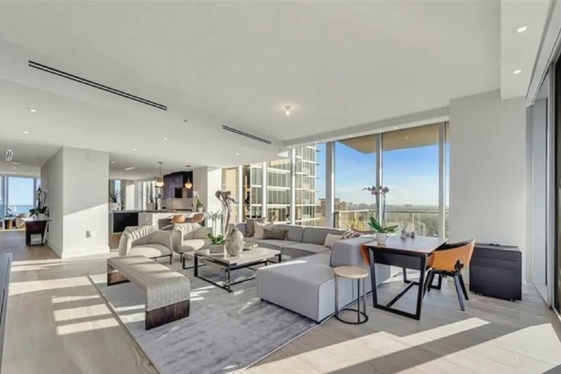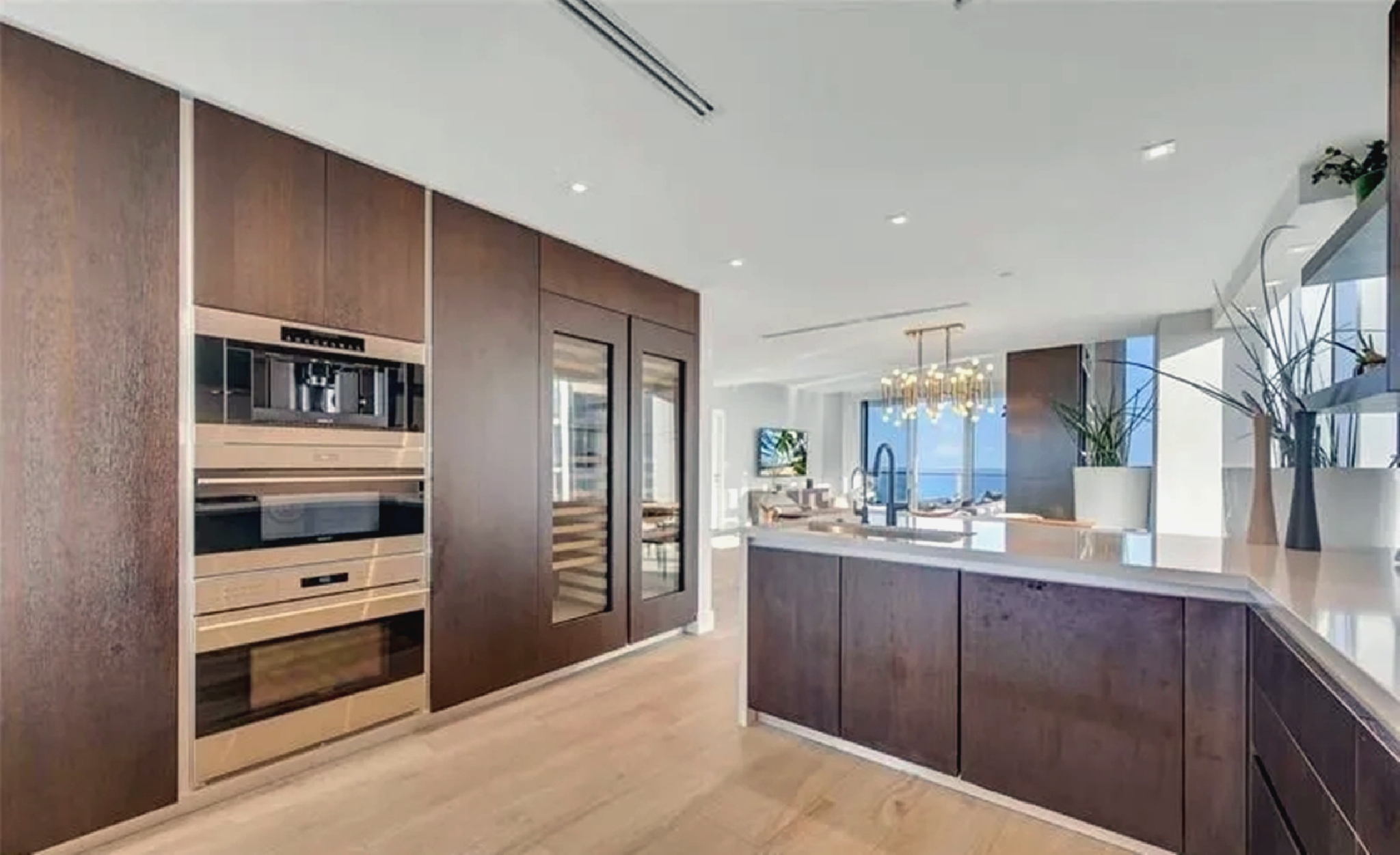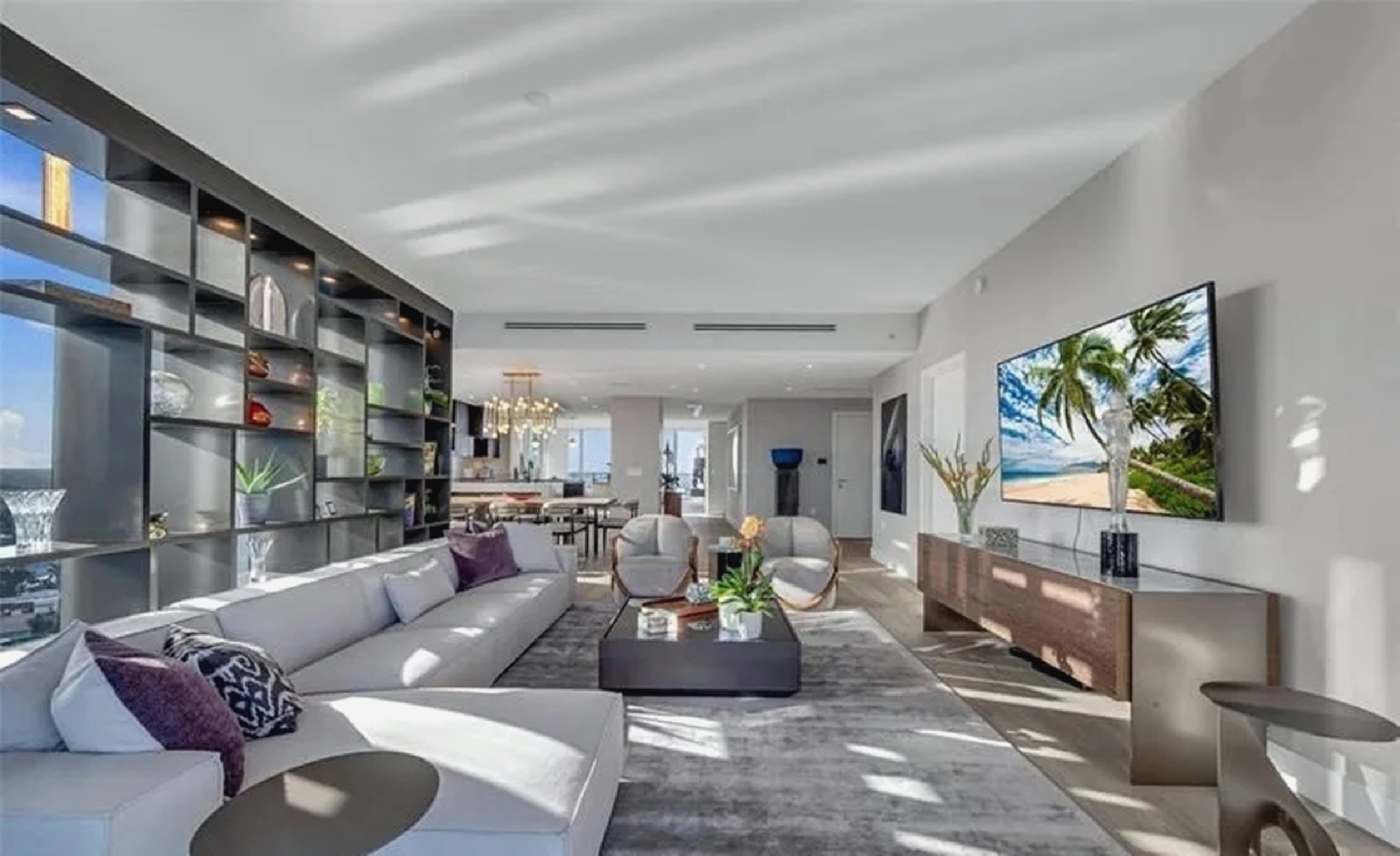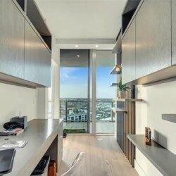 This three bedroom, four bathroom oceanfront penthouse offers over 3,400 square feet of refined living space with two private terraces showcasing sweeping views of the ocean, Intracoastal, and city skyline. The primary suite features dual sinks and a soaking tub, while the interior is finished with modern details, large windows, and custom built-ins that create a bright and elegant setting. Guests can enjoy resort-style amenities including a heated pool, cabana, fitness center, and café, along with two garage spaces and valet service for added convenience, making this residence an ideal destination for a luxurious coastal stay.