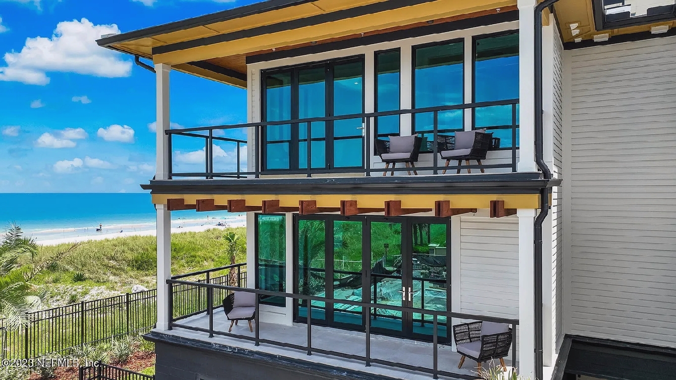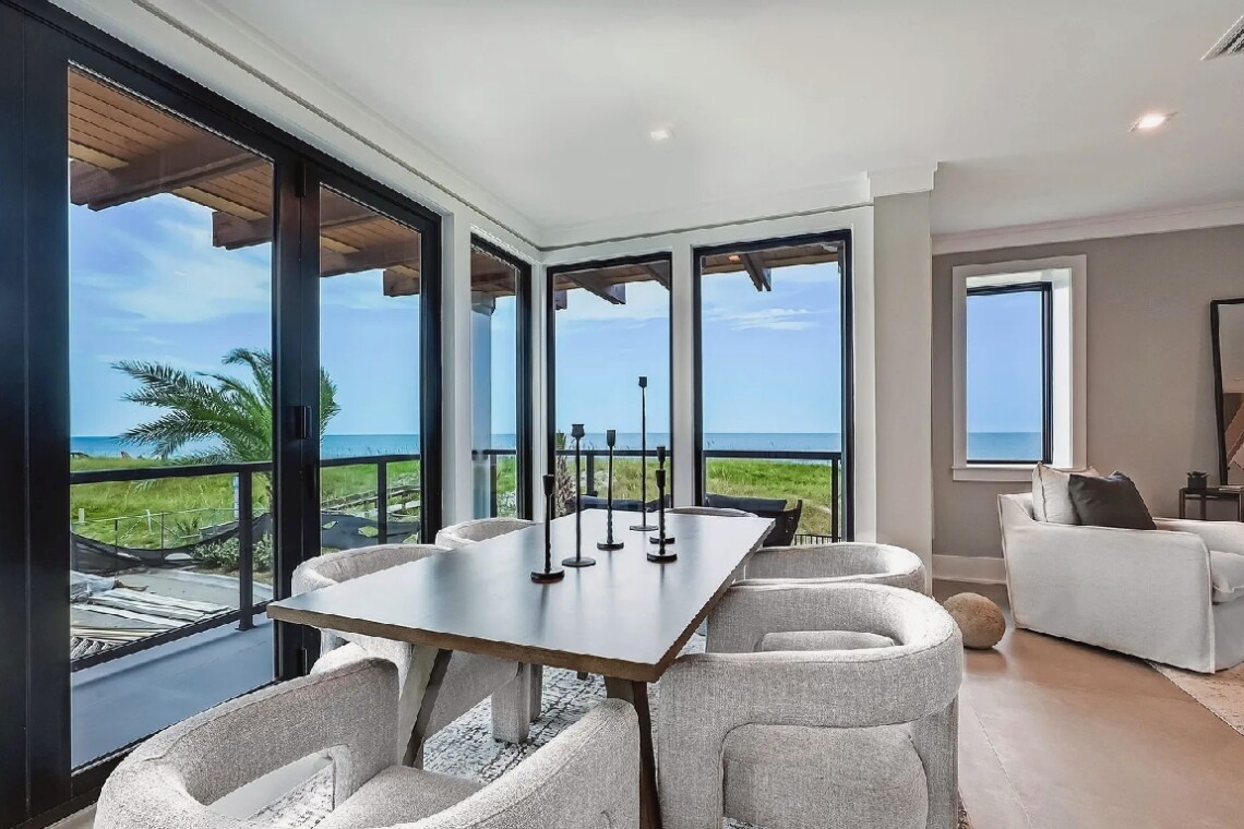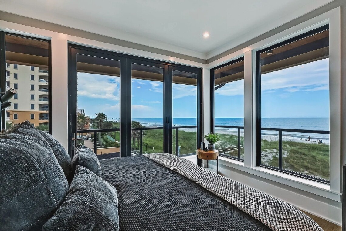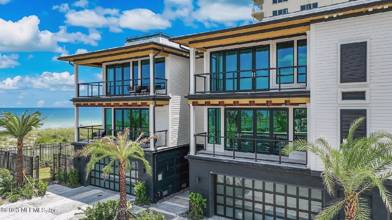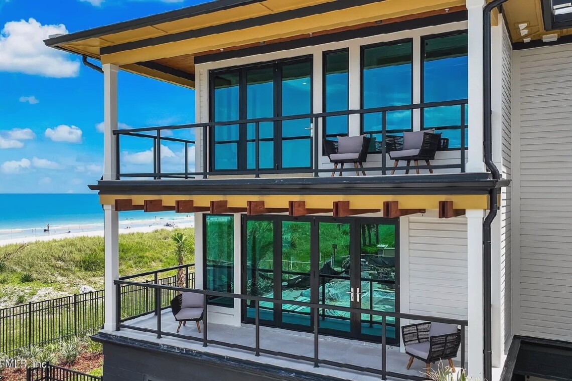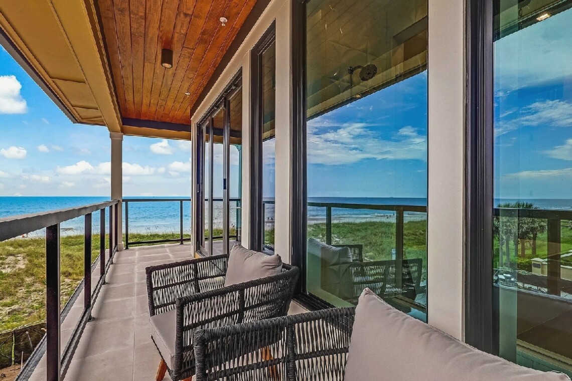 This three bedroom, four bathroom residence offers over 2,500 square feet of coastal living across three stories with sweeping Atlantic views from every level. The open-plan main floor features a gourmet kitchen with Wolf and Thermador appliances, floor-to-ceiling windows, and a spacious balcony, while the upper level includes a serene primary suite with spa-style bath and an additional ensuite guest room. Guests enjoy private amenities such as an oceanfront pool, rooftop patio with fire pit, and a backyard designed for entertaining, all within an exclusive five-unit community in Jacksonville Beach.