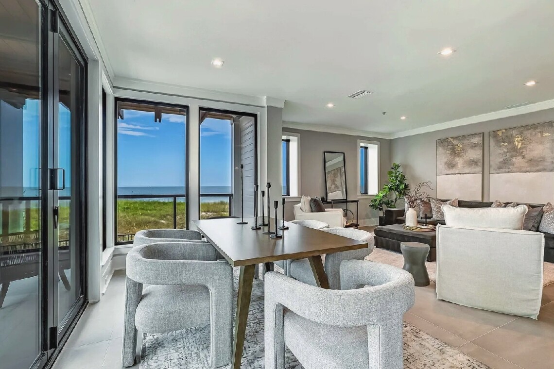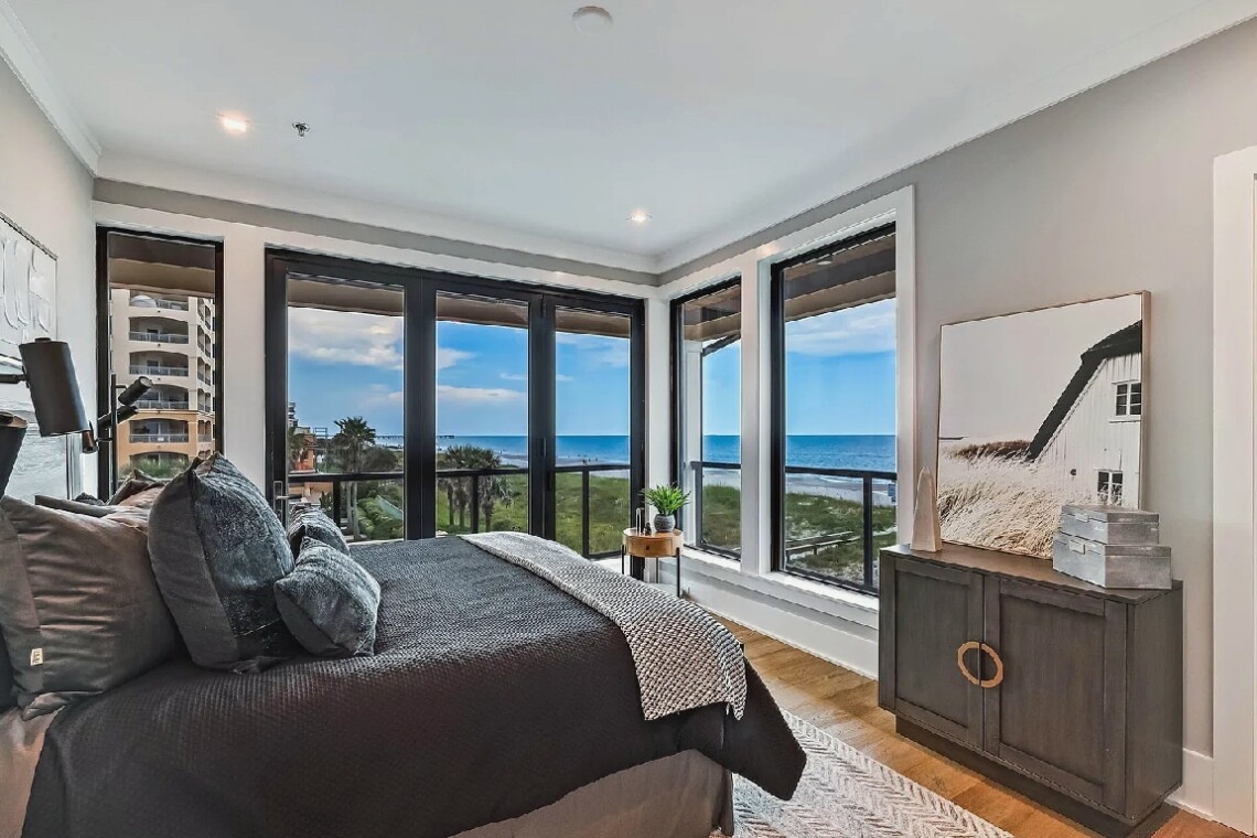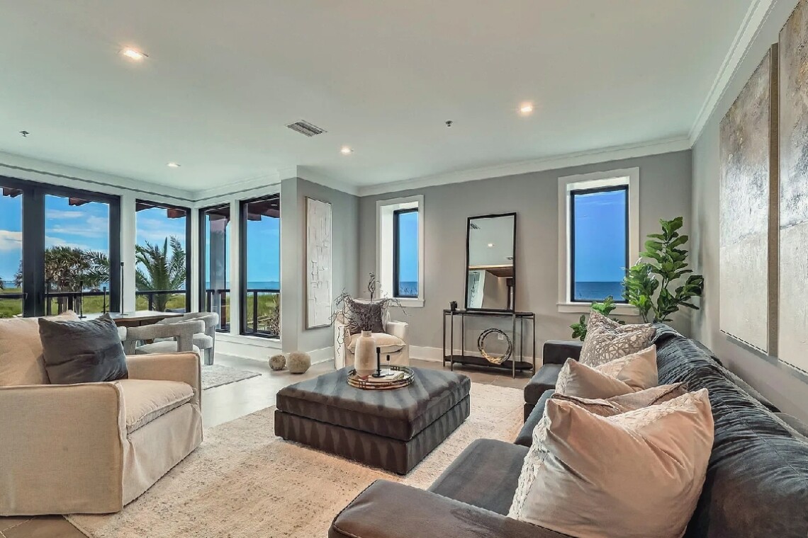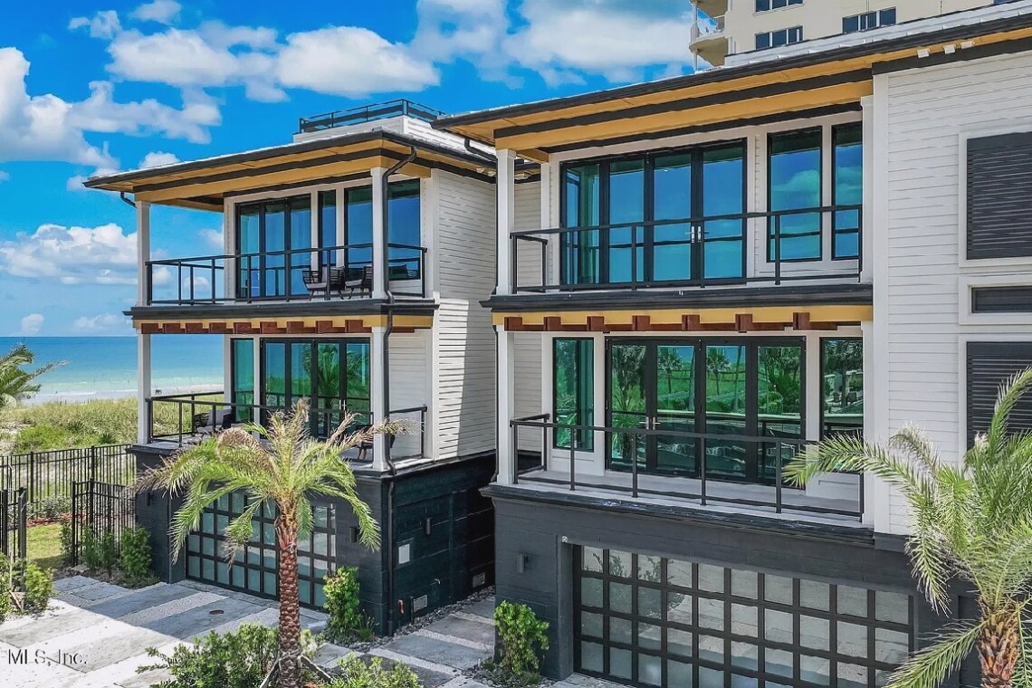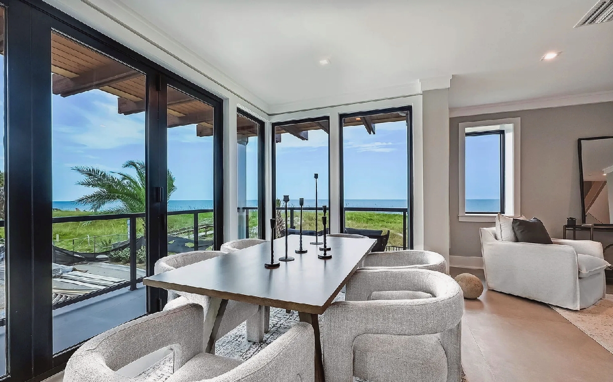 This three bedroom, four bathroom residence offers over 2,500 square feet of coastal living across three stories with sweeping Atlantic views from every level. The open-plan main floor features a gourmet kitchen with Wolf and Thermador appliances, floor-to-ceiling windows, and a spacious balcony, while the upper level includes a serene primary suite with spa-style bath and an additional ensuite guest room. Guests enjoy private amenities such as an oceanfront pool, rooftop patio with fire pit, and a backyard designed for entertaining, all within an exclusive five-unit community in Jacksonville Beach.