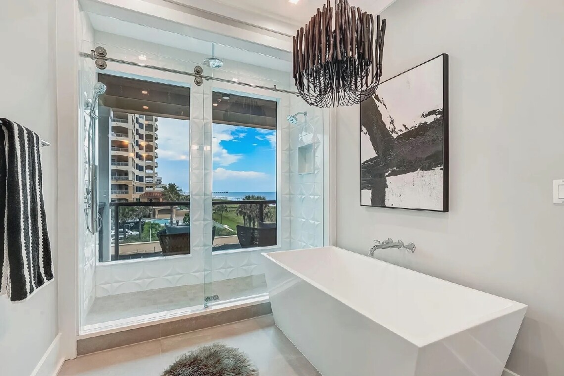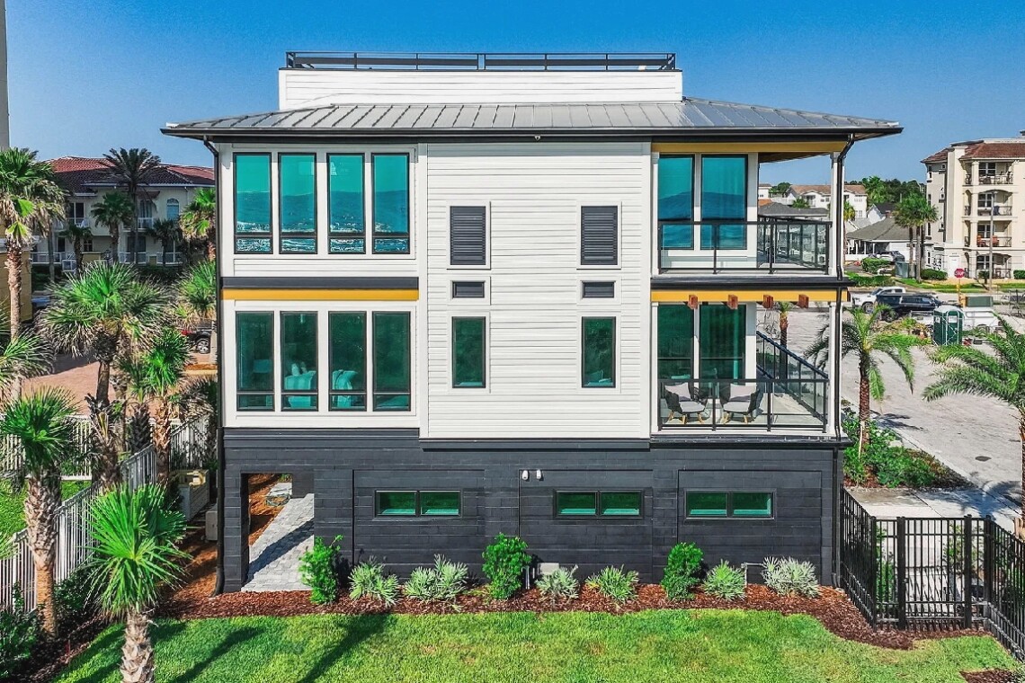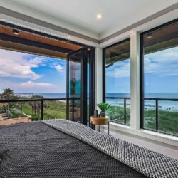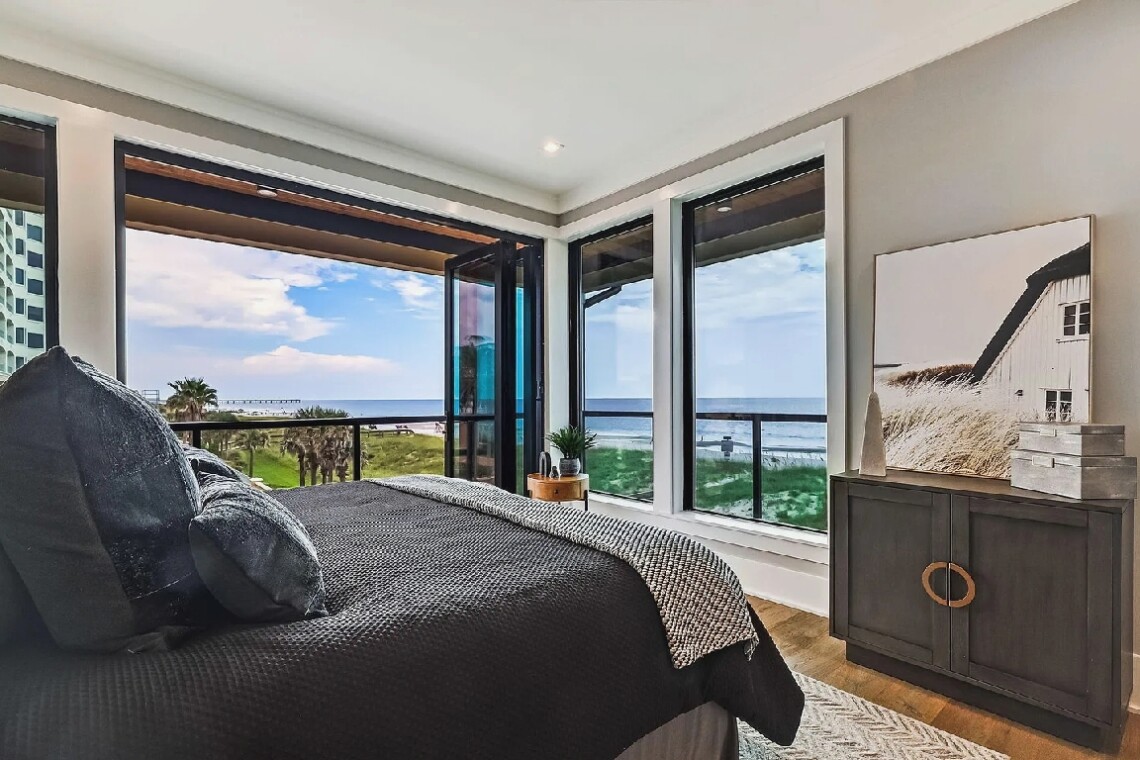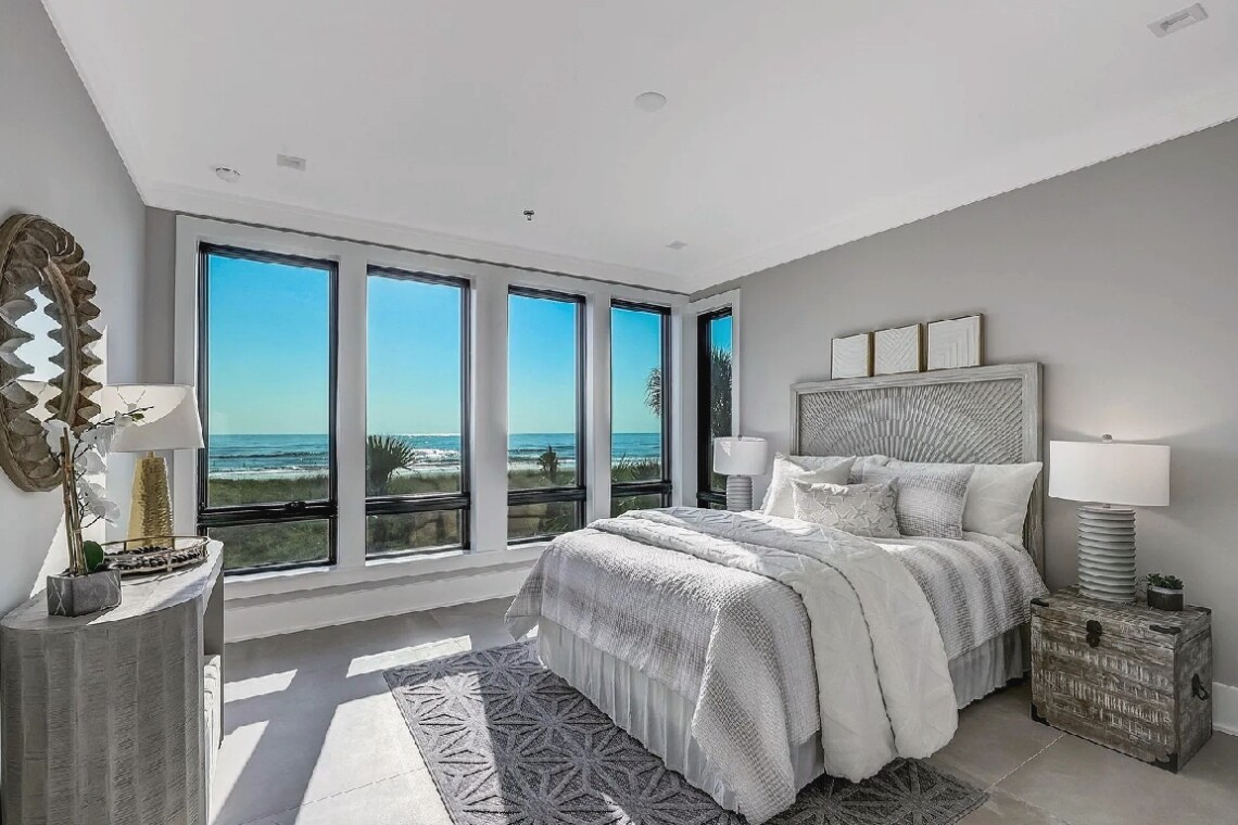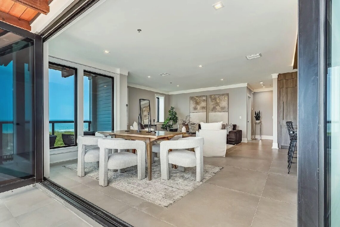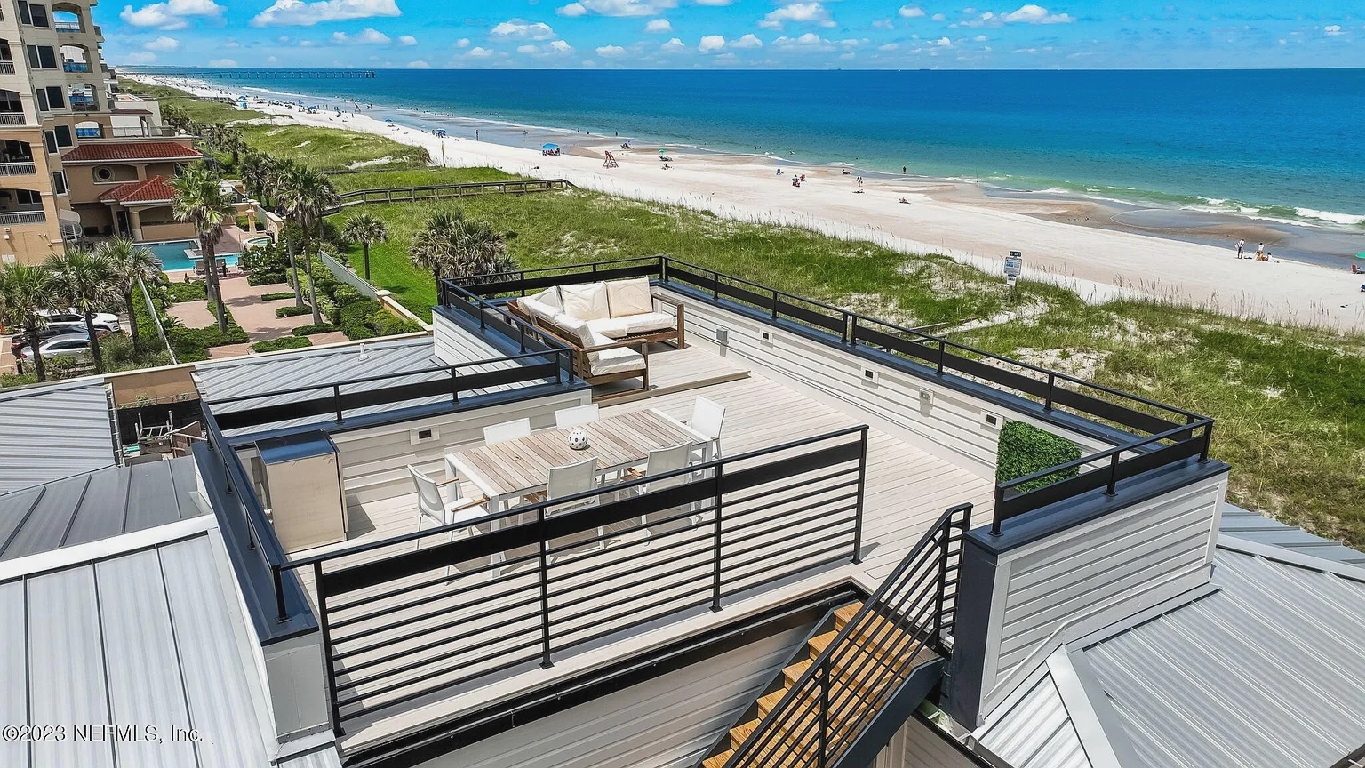 This three bedroom, four bathroom residence offers over 2,500 square feet of coastal living across three stories with sweeping Atlantic views from every level. The open-plan main floor features a gourmet kitchen with Wolf and Thermador appliances, floor-to-ceiling windows, and a spacious balcony, while the upper level includes a serene primary suite with spa-style bath and an additional ensuite guest room. Guests enjoy private amenities such as an oceanfront pool, rooftop patio with fire pit, and a backyard designed for entertaining, all within an exclusive five-unit community in Jacksonville Beach.