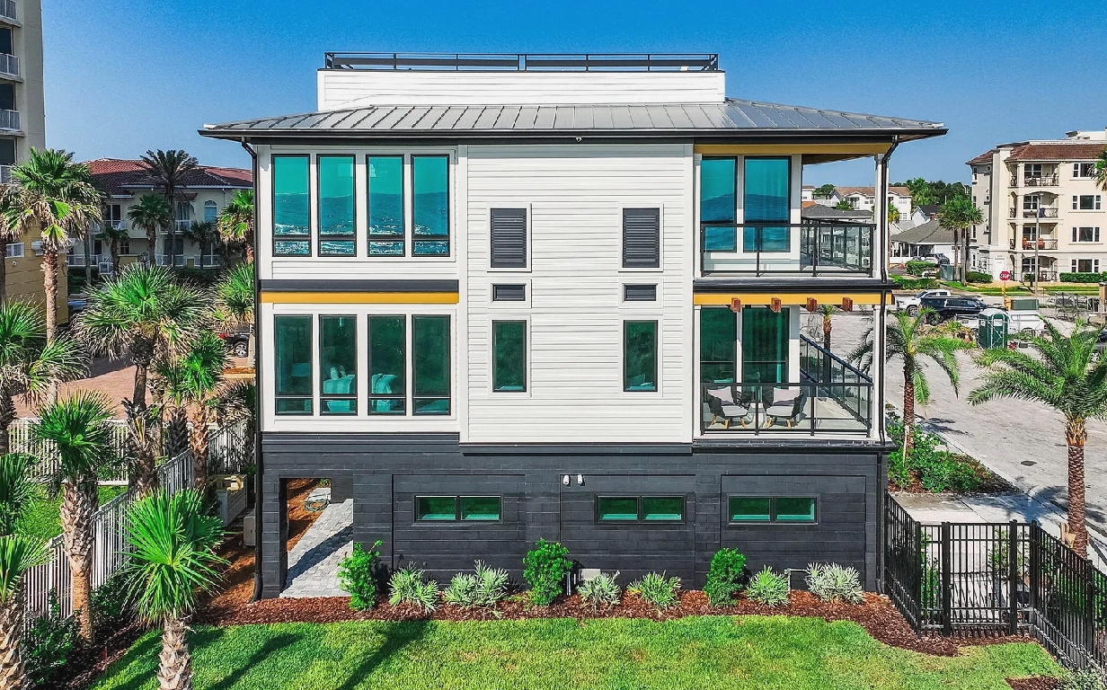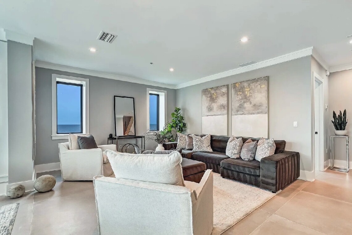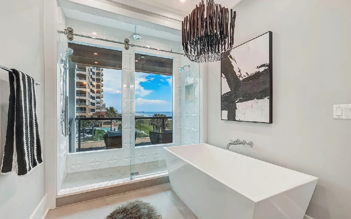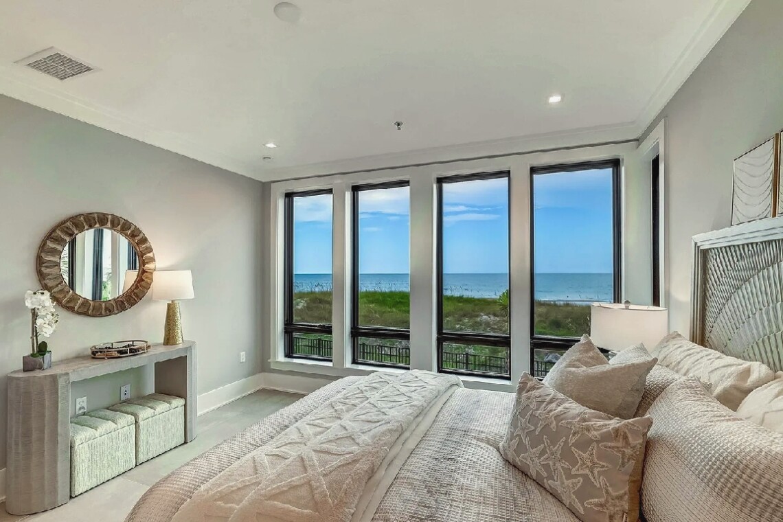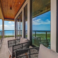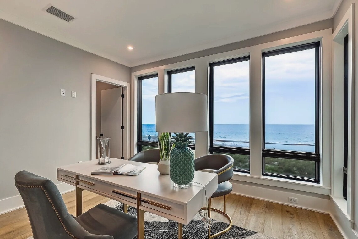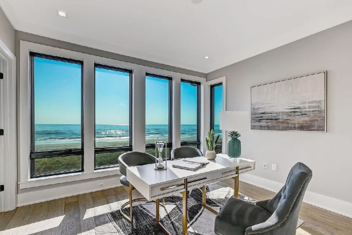 This three bedroom, four bathroom residence offers over 2,500 square feet of coastal living across three stories with sweeping Atlantic views from every level. The open-plan main floor features a gourmet kitchen with Wolf and Thermador appliances, floor-to-ceiling windows, and a spacious balcony, while the upper level includes a serene primary suite with spa-style bath and an additional ensuite guest room. Guests enjoy private amenities such as an oceanfront pool, rooftop patio with fire pit, and a backyard designed for entertaining, all within an exclusive five-unit community in Jacksonville Beach.