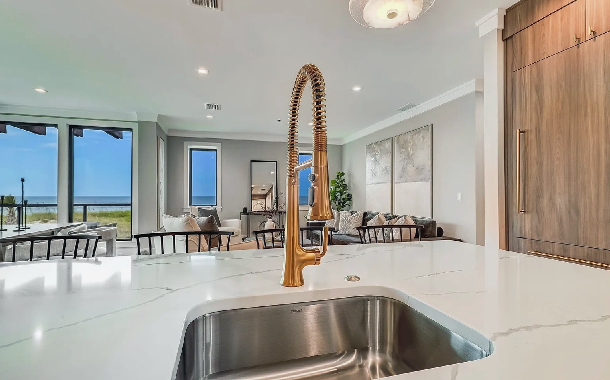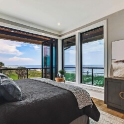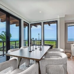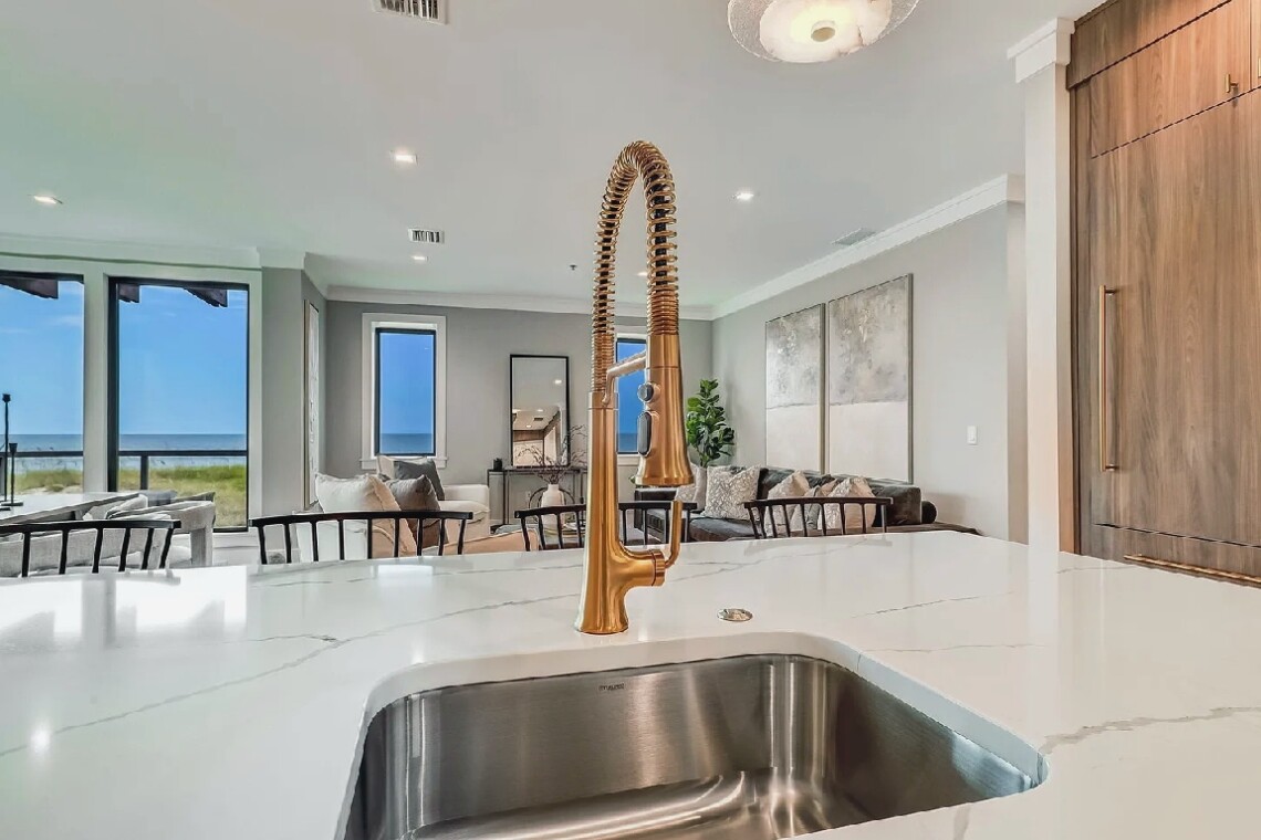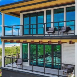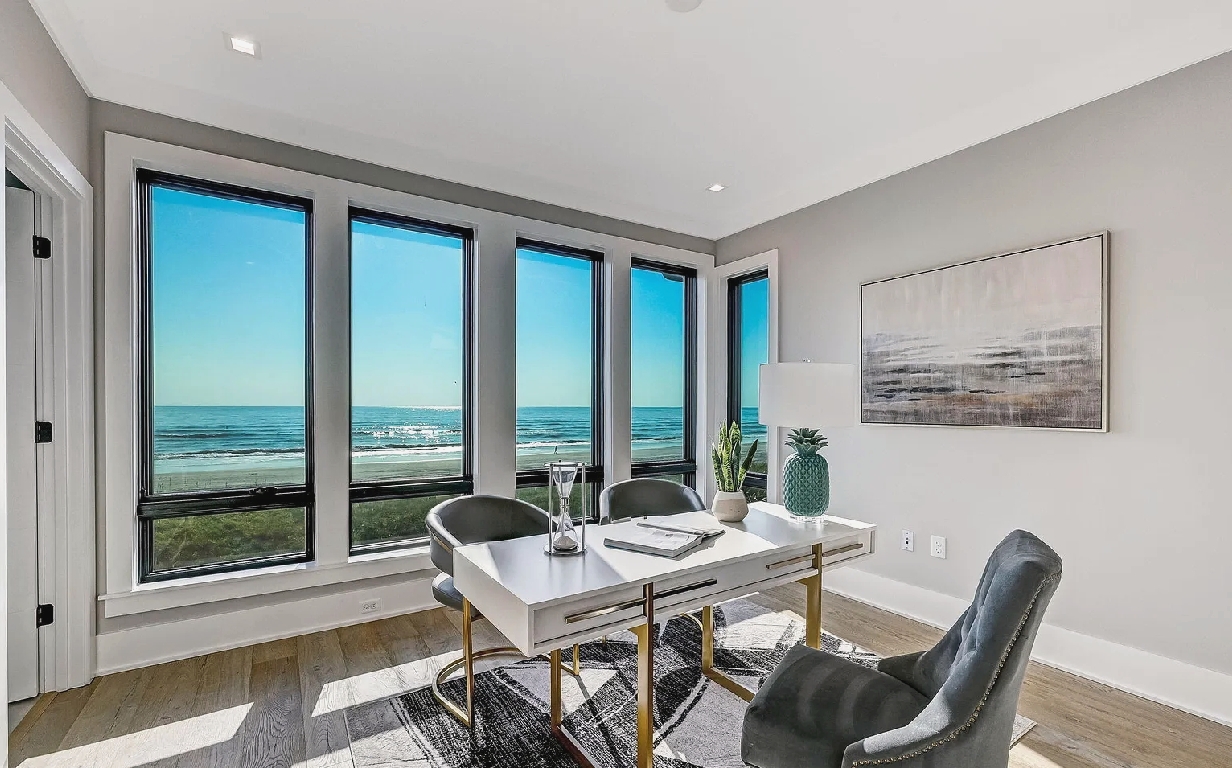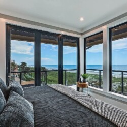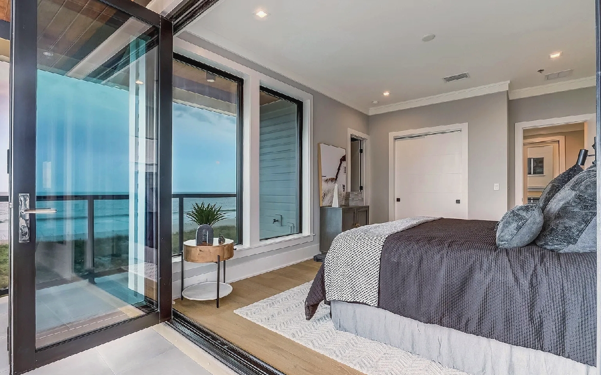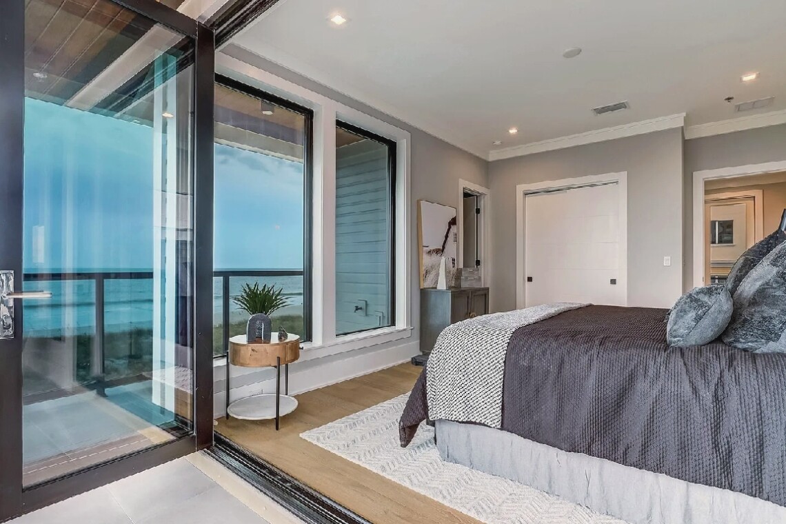 This three bedroom, four bathroom residence offers over 2,500 square feet of coastal living across three stories with sweeping Atlantic views from every level. The open-plan main floor features a gourmet kitchen with Wolf and Thermador appliances, floor-to-ceiling windows, and a spacious balcony, while the upper level includes a serene primary suite with spa-style bath and an additional ensuite guest room. Guests enjoy private amenities such as an oceanfront pool, rooftop patio with fire pit, and a backyard designed for entertaining, all within an exclusive five-unit community in Jacksonville Beach.